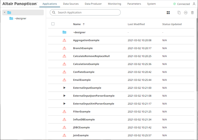 1.     To execute an application, ensure the   icon displays before the Name. This means the necessary data sources are already uploaded.