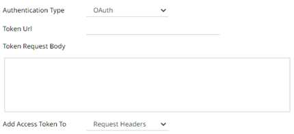 Then enter the following settings: o Token URL – The URL to retrieve the access token from. o Token Request Body – The request body used for access token requests. o Add Access Token To - The Access token retrieved from the Token URL can be added to headers, URL or request body, depending on how the REST endpoint needs the token.