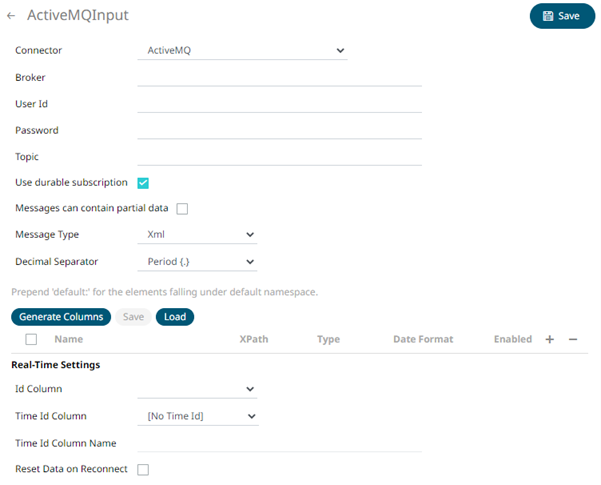 1. In the New Data Source page, select Input > Active MQ in the Connector drop-down list.