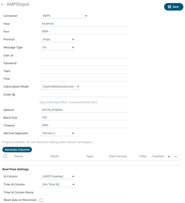1. In the New Data Source page, select Input > AMPS in the Connector drop-down list.