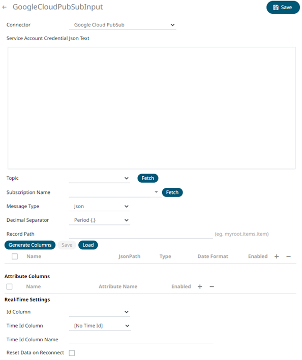 1. In the New Data Source page, select Input > Google Cloud PubSub in the Connector drop-down list.
