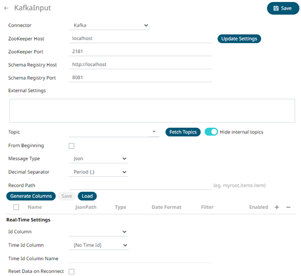 After clicking By default, the value is localhost:9092,broker:29092. However, this can be overridden by specifying another bootstrap server in the External Settings text box (as specified in step 3). |