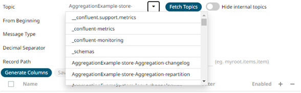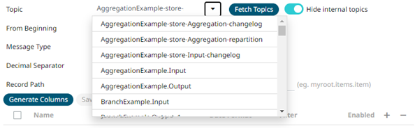 Tap the slider to turn it off. The internal Kafka topics are also displayed in the drop-down list.