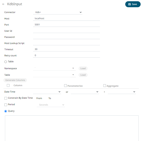 The Kx kdb+ input data source allows connection to the Kx kdb+ databases on a polled basis.