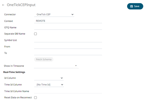 1. In the New Data Source page, select Input > OneTick CEP in the Connector drop-down list.