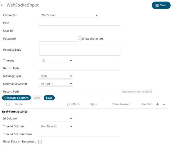 1. In the New Data Source page, select Input > WebSocket in the Connector drop-down list.