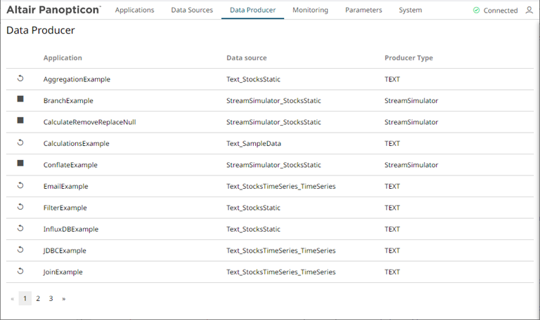 When an application has been started, the data producers used to generate data from the data sources will be displayed on the Data Producer tab where you can: