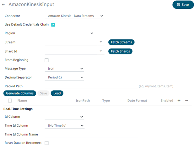 1. In the New Data Source page, select Input > Amazon Kinesis – Data Streams in the Connector drop-down list.
