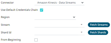 The Access Key ID and Secret Key Access from the AWS account can be configured in three places: · Two properties at the Streams.properties file which is available in the AppData folder of the Panopticon Streams Server o connector.kinesis.datastreams.accesskeyid o connector.kinesis.datastreams.secretaccesskey If this is the used configuration, the Use Default Credentials Chain box is not displayed in the connector UI.