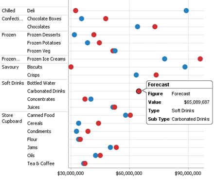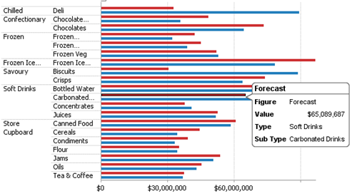 Figure 3-16. A sample horizontal bar graph showing revenues versus forecasts.