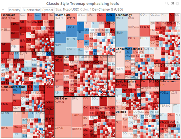 Our Treemaps are not static pictures. The real value of the visualization is quickly apparent when you interact with the data. Users can zoom, filter, and view details on demand, as well as link to and highlight other sources of information. For example, fund managers can link to a trading system directly from within the Treemap.
