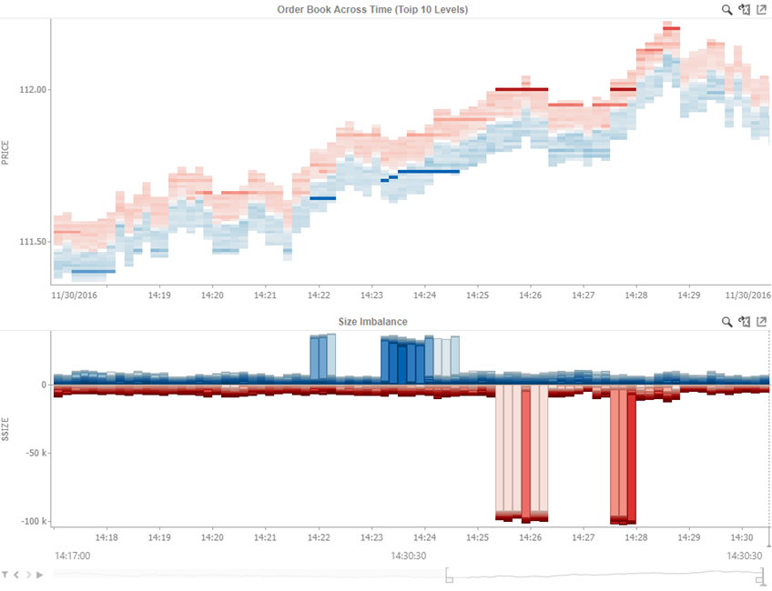 Figure 2-15. A needle graph with full width needles in combination with an Order Book graph.