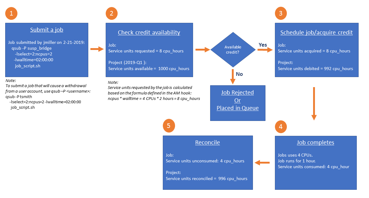 The hook uses the ncpus and walltime requested at job submission to calculate the amount of credit to assign to the job (Step 2).