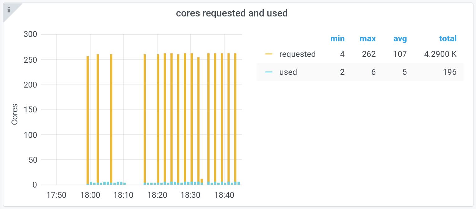 This chart provides the details of the requested cores and used cores in the cluster.