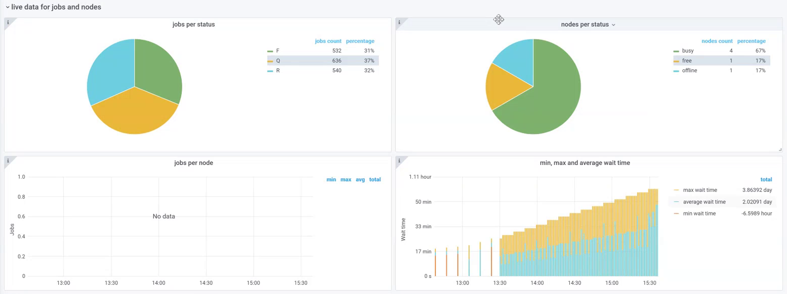 This dashboard provides real-time charts to monitor jobs per status, nodes per status, jobs per node, minimum, maximum and average wait time and the top 10 charts.