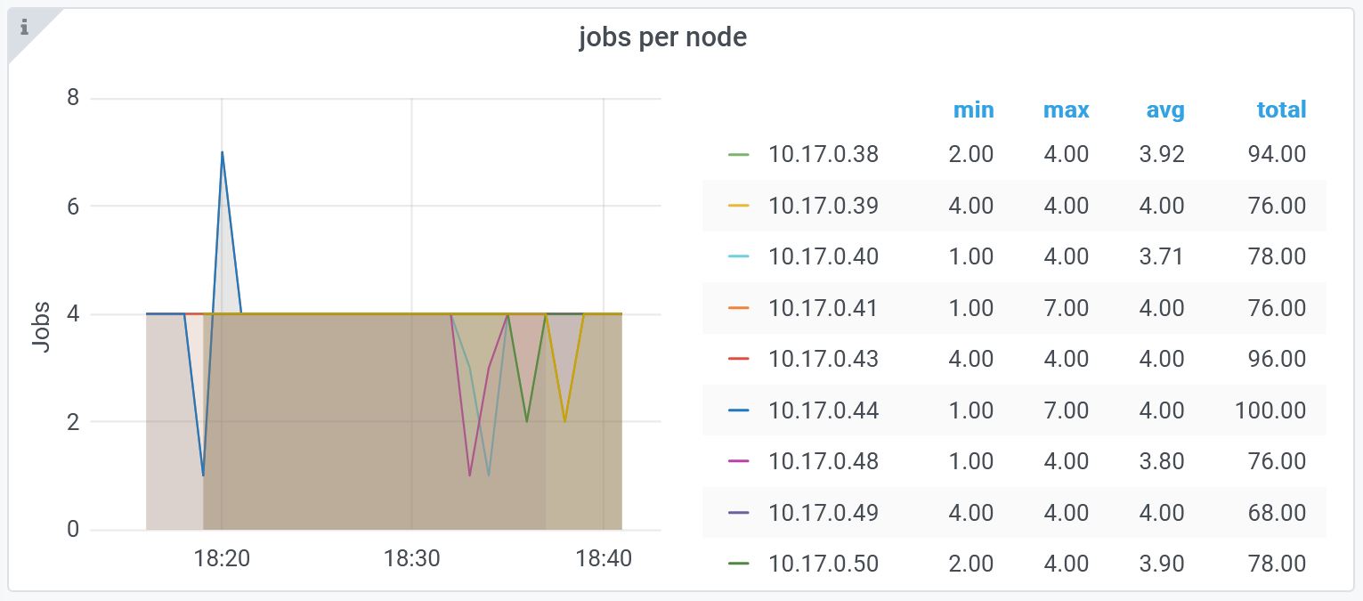 This chart provides the real-time details of the jobs per node in the cluster tracked by their status.