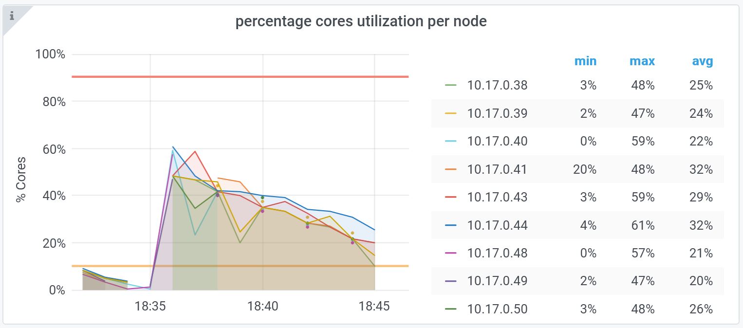 This chart displays the cores utilization percentage per node in the cluster.