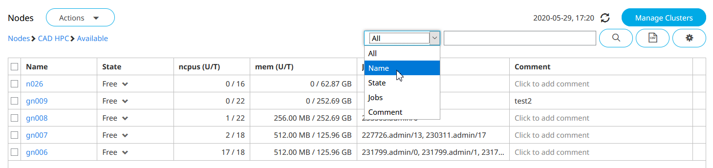 Search for nodes based on any of the node properties displayed in the list.