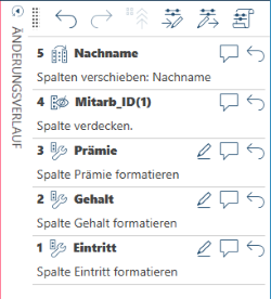 Monarch Data Prep Studio verfolgt alle an den Tabellen vorgenommenen Änderungen und protokolliert sie in der Änderungsverlaufliste. Beachten Sie bitte, dass Änderungen sowohl im Fenster Vorbereiten als auch in den Phasen Verknüpfen und Anhängen verfolgt werden.