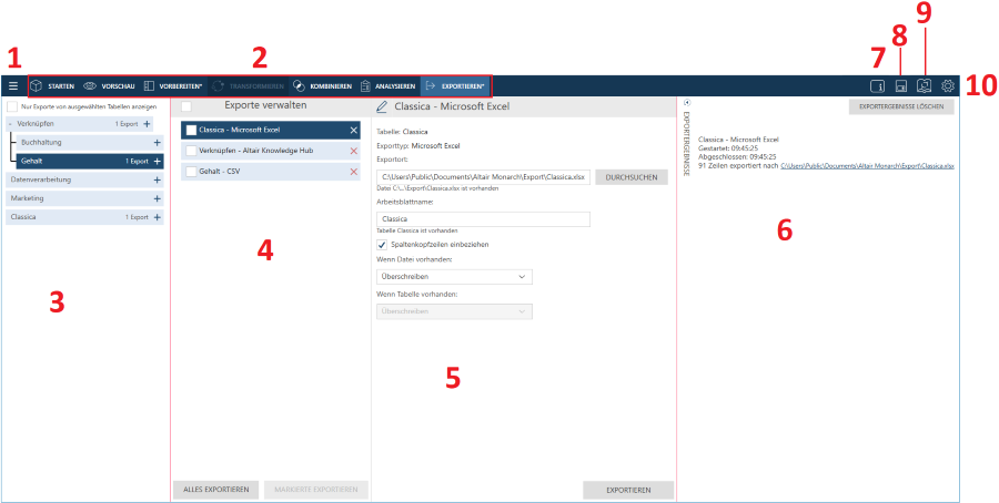 Dieses Fenster ermöglicht den Export von vorbereitete Tabellen in verschiedene Formate, darunter: