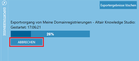 In diesem Fensterbereich werden die Ergebnisse aller laufenden und abgeschlossenen Exportvorgänge angezeigt. Sie können einen Export jederzeit abbrechen, indem Sie auf die Schaltfläche Abbrechen klicken, die rechts neben einem Ergebnis angezeigt wird, wenn der Exportvorgang läuft.