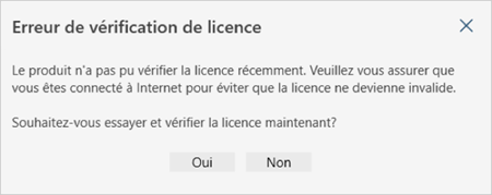 Si vous voulez effectuer la vérification de votre licence, vérifiez que vous êtes bien connecté à Internet avant de cliquer sur Oui dans la fenêtre.