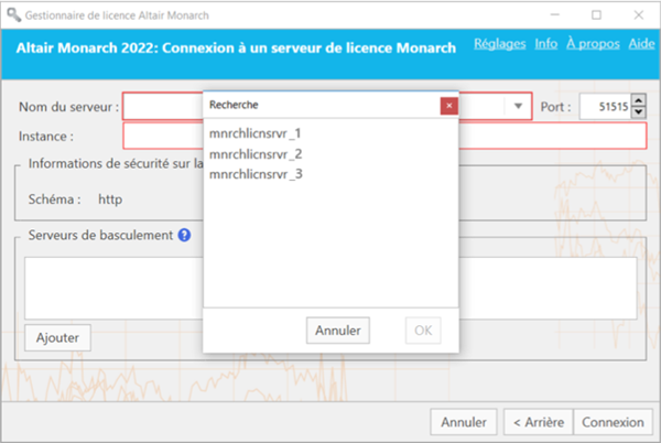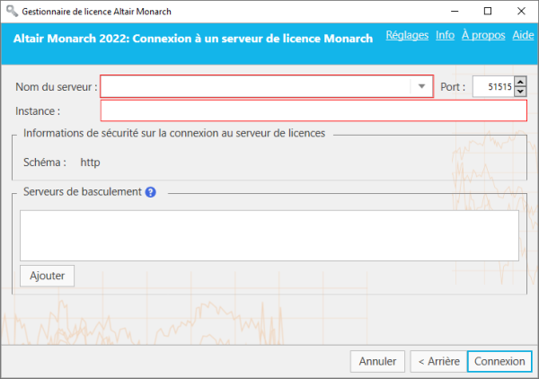 Saisissez le nom du serveur de licence auquel vous désirez vous connecter dans le champ Nom du serveur. Vérifiez l’exactitude du port.