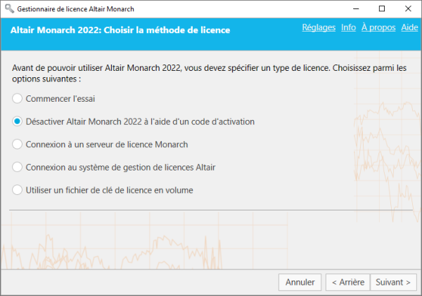 Lancez le Gestionnaire de licence. Sur l’écran Choix de méthode de licence, vérifiez la sélection de l’option Désactiver Altair Monarch 2022 à l’aide d’un code d’activation et cliquez sur Suivant.