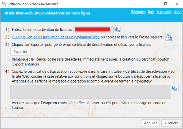Remarque : En cliquant sur le bouton Export, vous désactivez localement votre produit Altair. Vous ne pourrez cependant pas utiliser le code d’activation sur un autre ordinateur avant d’avoir cliqué sur le bouton Désactiver la licence sur le site Web d’activation.