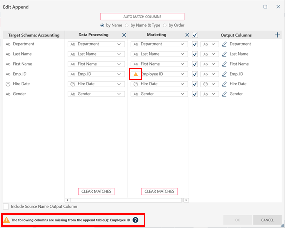 When you edit the append, Monarch Data Prep Studio also shows the column(s) causing the problem and a description of the issue: