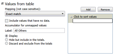 If you prefer not to suppress the accumulated unmatched values, you can have them displayed in the summary under an All Others label (or the label of your choice). To do so, simply clear the Discard or Hide Unmatched Value Rows check box.