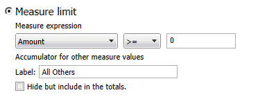Note: You should be aware that if your summary includes a Total line, it represents the total of all the values, including the hidden ones, not just the ones that are displayed. For this reason, in most cases you should not include a total line in a summary if you are using First n or Measure Limit matching and the Hide unmatched value rows option is selected. With Specified Values and Upper Limit Values matching, values that do not match are actually discarded from the calculations, not simply hidden, so the total will be correct for all the visible values.
