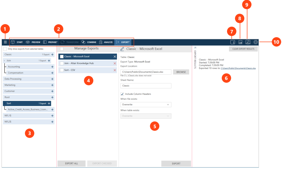 This panel displays all of the tables you have selected for export. You can use this panel to instruct Data Prep Studio to export individual (selected) or all tables.