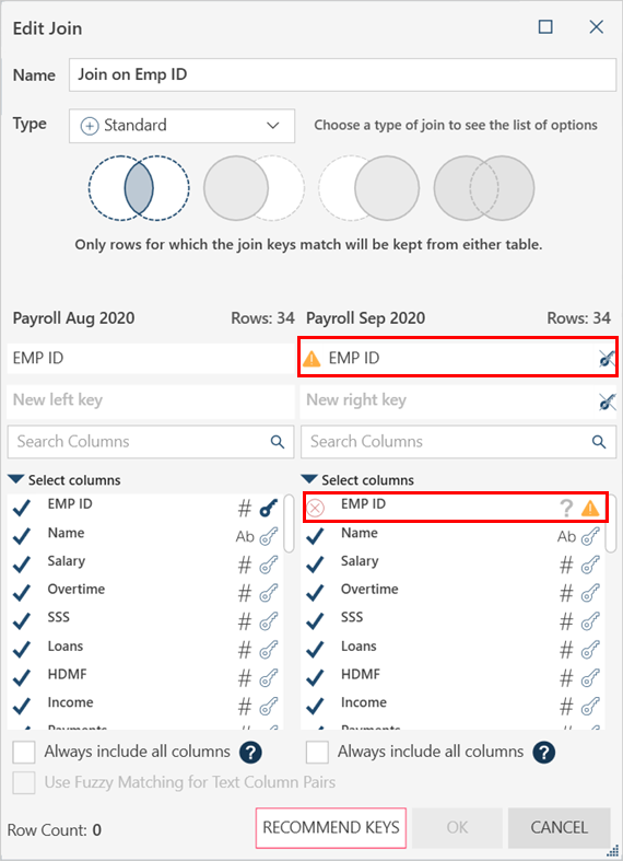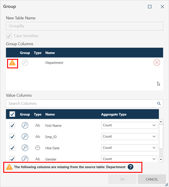 In this case, Monarch Data Prep Studio will display a warning before the transformed table when the data is refreshed. When you edit the transform, warnings are also displayed before the problematic column. In some cases messages are displayed to help you fix the issue: