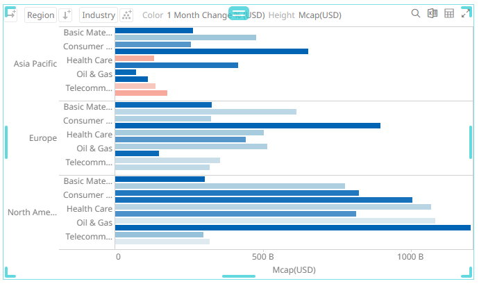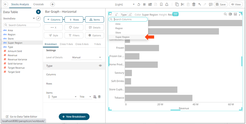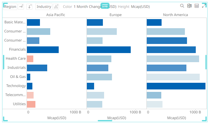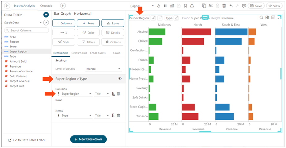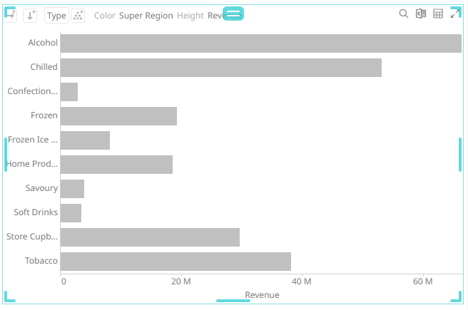 Once dropped or selected, the visualization will be cross tabbed, producing a series of smaller visualizations for each item within the column dropped.