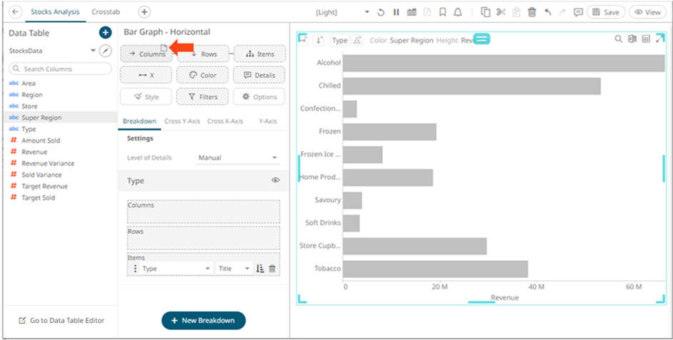 1. Select a visualization that supports cross tabbing like a Bar Graph.
