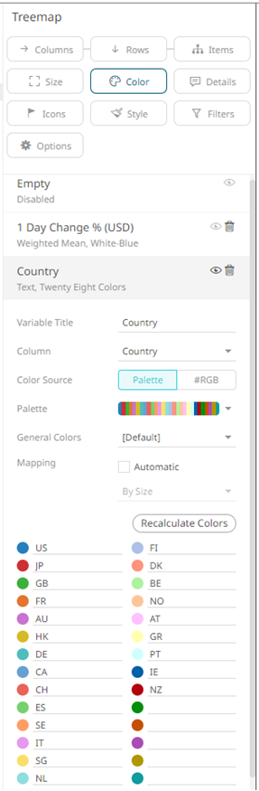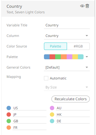 When a text column is added to the Color variable, the configuration pane displays the color associated with each categorical item, as specified with a default color palette (e.g., Twenty Eight Colors).