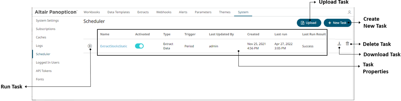 The task properties include: · Name of the task · Activated status · Type of the scheduled task · Trigger type: Period or CRON · Last user who made an update · Date/Time when the task was created · Date/Time when the task was last ran · Last run result: Success or Failed For failed results, you can hover on the tooltip to view the error. NOTE: The result is not displayed for Extract Data scheduler type.