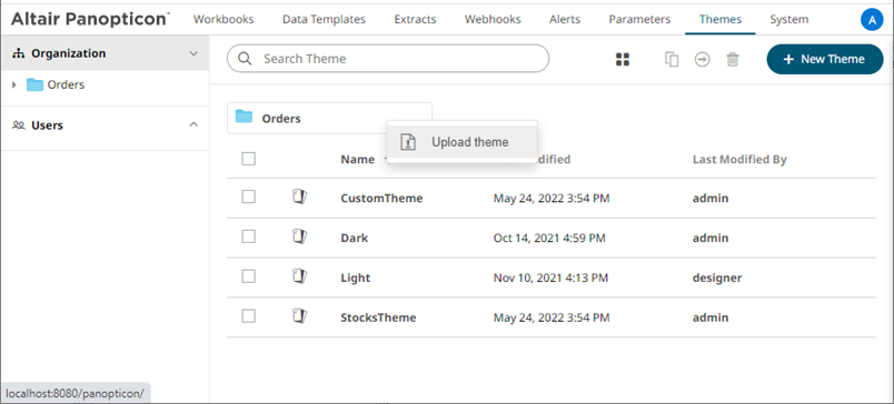 1. Click on a folder of subfolder where the user has permission to upload a theme then select Upload Theme on the context menu.