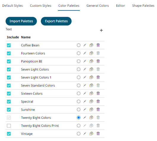 Click the Duplicate  icon of a color palette. A copy of the color palette is added in the list (e.g., Seven Light Colors 1).