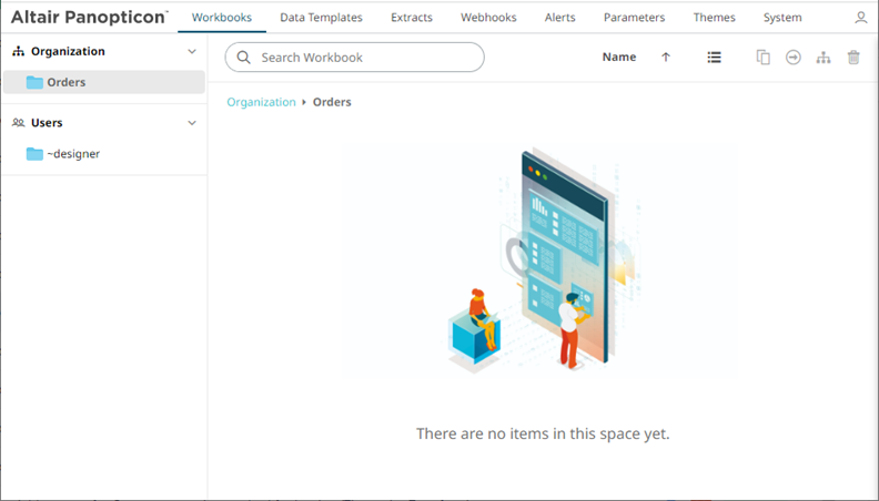 Users that log on with a Designer role will have their own personal folder created and displayed on the Workbooks page (e.g., ~designer). The personal folders: · are displayed and can be accessed for users with an Administrator or Designer role · are where Designers can create workbooks and build dashboards. For more information, refer to Altair Panopticon Web Authoring Guide on how to create workbooks on the Web client.