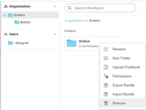 3.     You can also opt to delete a subfolder by right-clicking on the folder and selecting Remove on the context menu as long as it does not contain published workbooks.