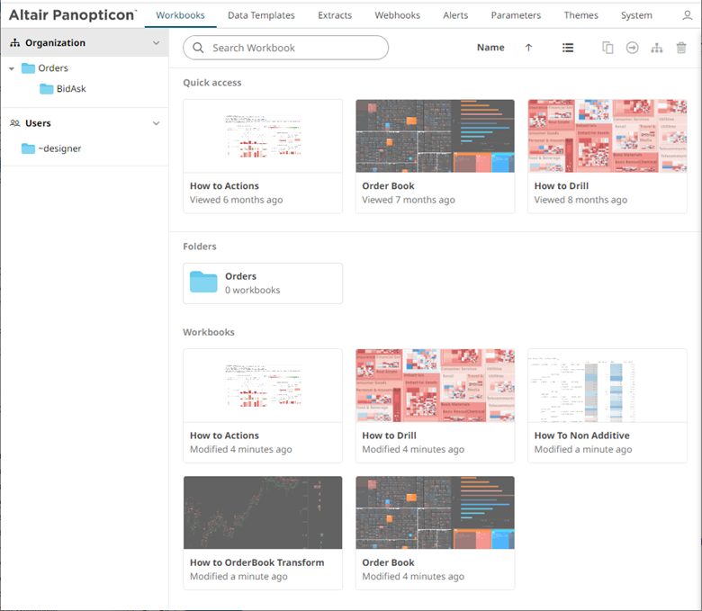q The Workbooks include their titles, thumbnail images, and when they were last modified.