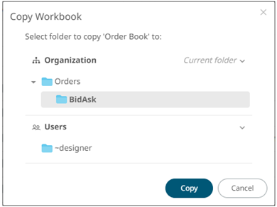 The Copy Workbook dialog displays with the folder or subfolders the user is allowed to copy the workbook to.