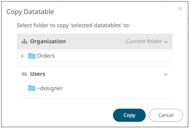 The Copy Datatable dialog displays with the folder or subfolders the user is allowed to copy the data template.