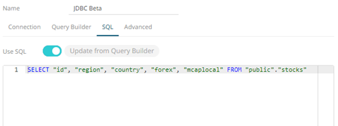 JDBC Beta connector is the new version of JDBC connector and is the recommended connector for any new JDBC connectivity for better performance and configuration UI. Just like JDBC connector, it also allows the retrieval and processing of data from virtually any database, that has a JDBC driver.