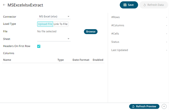 When a file is selected the MS Excel (xlsx) connector will automatically select the first available sheet, and populate available columns.