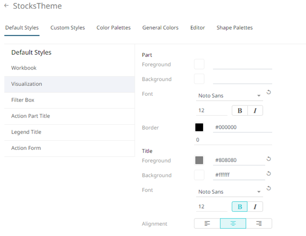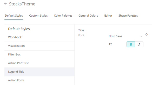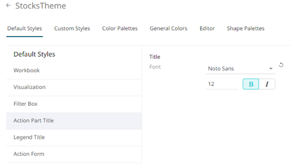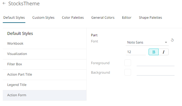 When you define the default settings of a theme, you specify the colors and fonts of the workbook, visualizations, filter box, action part title, legend title, and action form.