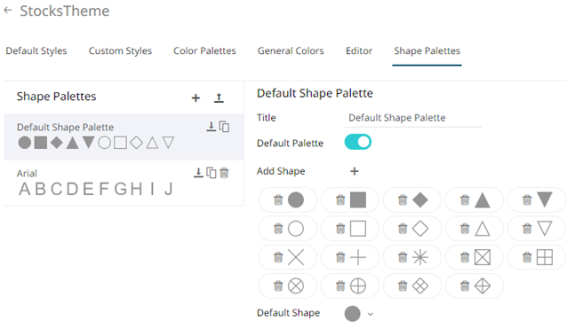 When you define the shape palettes of a theme, you specify the settings of shape palettes and add, upload, download, duplicate, or remove them.