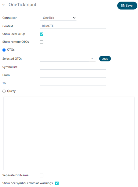 The OneTick connector allows connection to OneMarketData OneTick tick history databases on a polled basis. In general, it is used to retrieve conflated time series data sets. The connector supports either: